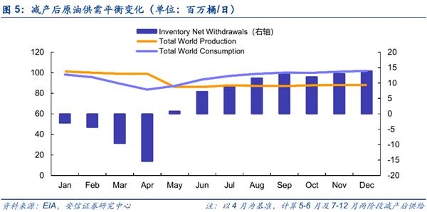 同时,作为世界上原油最大的“卖家”,当前极低的原油价格并不符合三方的共同利益,石油减产稳定油价势在必行。OPEC+已达成了史上最大的减产协议,OPEC宣布5月和6月减产970万桶/天,2020年剩余时间减产800万桶/天,2021年1月至2022年4月减产600万桶/天。仅OPEC宣布减产的量就相当于目前全球供应量的10%。将减产目标计入原油供需平衡表后,我们发现原油市场有望从4月1540万桶/日的库存累积转变为6月730万桶/日的库存消耗,届时油价有望从低位回升。