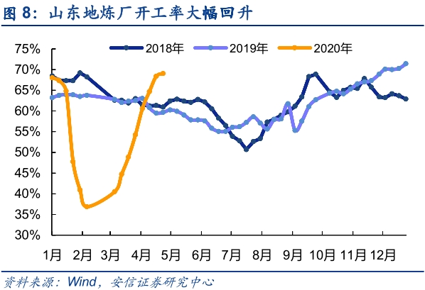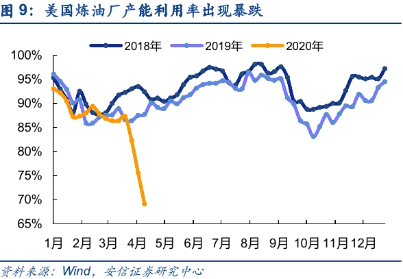 中美炼厂开工率是判断近期石油需求变化的一个很好的指标,1月下旬山东炼厂开工率大幅滑落至40%以下,进入4月后已经快速回升至正常水平甚至超过往年同期,这意味着中国石油需求有望出现显著提振。美国炼厂直到3月底才开始出现产能利用率的大幅下滑,类比山东的情况该数据有望在6月恢复至正常水平。因此,我们认为疫情造成的炼厂停产和石油需求大跌只是短期现象,随着中国炼厂开工率的攀升和美国炼厂开工率的企稳回升,炼厂的石油需求有望在5-6月见底回升。