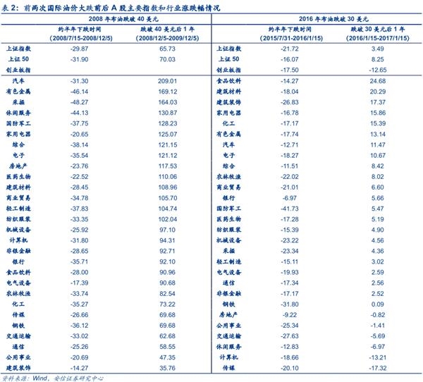 油价下跌对经济活动和预期的影响也会反映在证券市场上。回顾前两次油价大跌的历史(08年布油跌破40美元和16年布油跌破30美元)可以发现,约半年的主要下跌时期往往也是经济衰退和金融动荡时期(与油价下跌之间的相互关系暂不展开讨论),A股主要指数和大部分行业均处于下跌区间。而油价见底回升后的1年时间中,由于货币政策的放宽和经济政策的调整(09年四万亿和16年供给侧改革),A股主要指数和大部分行业都出现了一定程度的上涨。09年时由于货币更宽松、刺激政策力度更强,A股涨幅也更大。