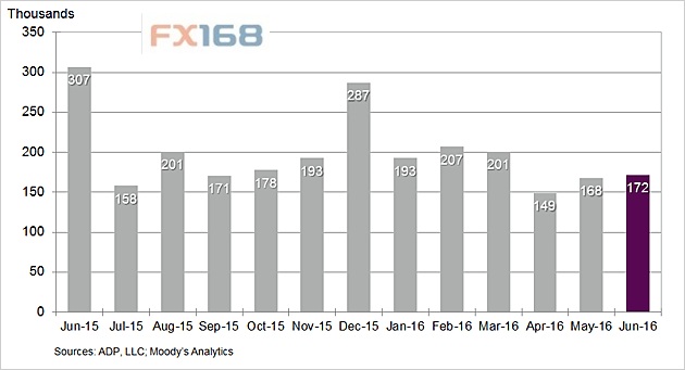 数据显示,美国6月ADP就业人数增加17.2万人,符合预期的增加16.0万人,前值修正为增加16.8万人,初值增加17.3万人。
