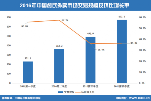 据中国电子商务研究中心监测数据显示,2016年中国在线餐饮外卖市场呈爆炸式发展,交易规模约1524亿元,相比2015年的459亿增加了232%。