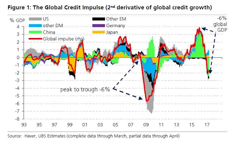 瑞银分析师Arend Kapteyn在报告中写到:全球信贷脉冲(占全球GDP的77%)在过去18个月内轰然倒塌,其主要原因就来自中国(绿色阴影部分)。尽管该国现在仍在每年创造着占GDP30%的新增信用,但由于信贷脉冲衡量的是信贷制造速度,巨大的信贷制造数量于事无补。相反,由于信贷制造增速呈雪崩式下滑,投资者们对中国是否会陷入信贷紧缩产生了忧虑。