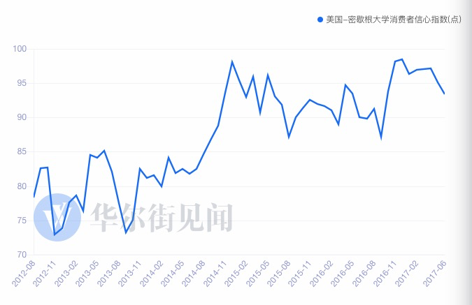 密歇根大学发布的消费者信心指数是反映美国消费者情绪的先行指标。2017年8月初值97.6,高于预期94和7月前值93.4,创1月份以来新高,表明美国民众对市场保持乐观情绪。