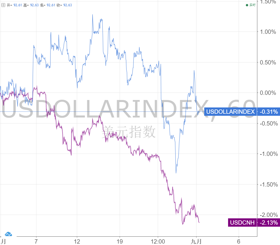 离岸人民币及美元指数近一个月走势
