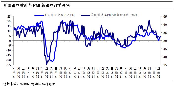最后,外需方面,在欧洲和中国经济增速放缓的背景下,叠加贸易摩擦问题,美国的出口从去年中期开始回落。全球经济增速疲软对美国经济的拖累体现在其外需方面,美国PMI新出口订单分项已从去年9月的56回落到今年2月的52.8,预示出口难有大幅回升,但正在进行的贸易谈判又会增加不确定性,如果中国对美加大采购,对外需会起到边际改善。