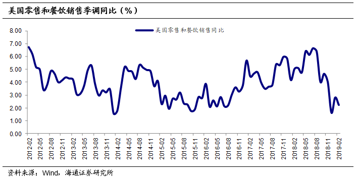 首先,三大需求中占比最大的是消费,去年末短期走弱。美国零售和餐饮销售的名义增速去年4季度以来从6%以上的位置大幅回落,19年1-2月同比增速都在3%以下,相当于16年中的水平。而消费是美国经济三大需求之首,占比在三分之二以上,消费走弱对美国经济的影响最大,这也是鲍威尔在3月新闻发布会上强调货币政策需要观望的主要依据之一,反映了经济放缓的担忧。