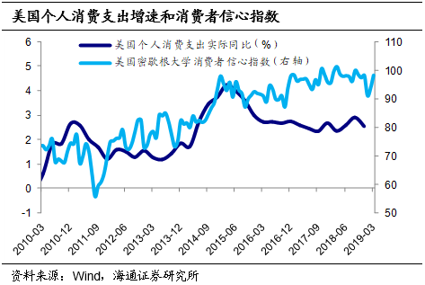 不过近期的消费者调查和薪资数据显示,消费似乎仍有支撑。3月美国消费者信心指数从1月91.2的低位连续两个月反弹,目前回升到98.4,持平于去年平均水平,反映了消费者预期的好转;同时,美国失业率仍在3.8%左右的低位,非农就业时薪增速触及3.4%的新高,意味着支撑美国消费的动力依然存在;此外,零售销售同比是名义增速,价格因素隐含在内,油价下降也会拖累增速。因此,1季度美国消费大幅失速的概率也不高。