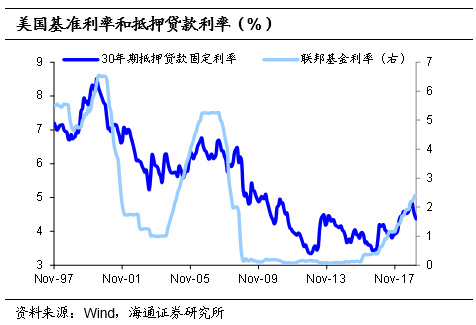 不过伴随美联储加息缩表,贷款利率大幅上行,房地产销售向下的压力已持续了一段时间。美国30年期抵押贷款固定利率持续走高,去年全年累计上行56BP,对房地产销售产生明显的压制,美国新建住房销售同比增速从17年末的16.5%大幅下滑至19年2月的0.6%。因此,尽管暂时无需担心美国房地产市场泡沫的问题,但基准利率上行仍对房地产销售产生影响。近期抵押贷款利率回落,房地产销售略有好转,但如果美联储未来进一步加息,住房销售可能再度转负,进而通过房地产产业链传递到中上游,最终拖累经济。