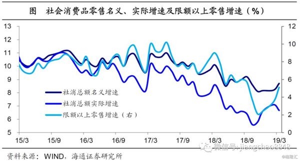 3月消费增速反弹回升。1季度社消零售、限额以上零售增速为8.3%、4.1%,较18年4季度一平一降,而3月增速分别为8.7%、5.1%,均较1-2月回升。分品类看,必需消费全线回升。食品、服装、日用品零售增速分别回升至11.4%、6.6%和16.6%。可选消费普遍回升,汽车仍是拖累。汽车零售降幅扩大至-4.4%,而石油及制品零售增速,以及地产相关的家电、家具、建材零售增速均现回升。1季度网上零售增速仍高达21%,占社零比重达18.2%。