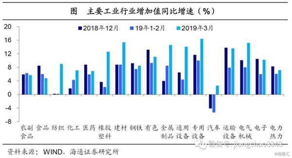中观层面,3月各行业增加值增速普遍回升。其中,下游消费类行业增速涨多跌少,其中汽车由负转正,仅农副、食品小幅回落;中游加工组装类行业、原材料类行业增速全线回升,尤其是加工组装类行业增速均大幅上行;上游采矿业增速明显回升。