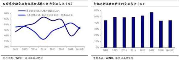 微观数据来看,对于自由现金流缺口,2018年A股非金融上市公司中,有超过43%的企业自由现金流缺口走扩,相较于2017年的57%有所下降,2019年一季度与18年基本持平,企业自由现金流情况有所好转。