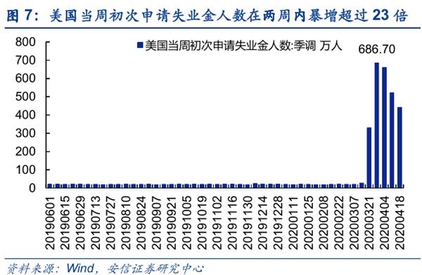 新冠肺炎疫情冲击下的全球经济疲软,无疑将导致未来一段时间内全球原油需求大幅萎缩,这是近期油价暴跌的另一个重要原因。2020年1季度,中国GDP增速录得1992年开始统计以来首次负增长,从去年四季度的6.0%暴跌至-6.8%,疫情对中国经济的冲击可见一斑。另一个能源消费大国美国的经济从3月下旬开始也遭受冲击,当周初次申请失业金人数在两周内暴增超过23倍,达到686.7万人,远超09年峰值时的66.7万人达到历史最高。5周以来,美国新增初次申请失业金人数2645万人。