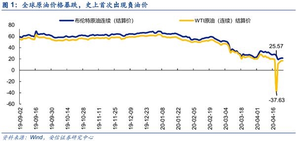 4月20日,5月交货的纽约轻质原油(WTI合约)期货价格暴跌约300%,收于每桶-37.63美元,这是历史上首次出现负油价。于此同时,国际基准6月合约的布伦特原油下跌8.8%,交投于每桶25.60美元;5月19日到期的6月WTI合约下跌约15.7%,报每桶21.10美元;7月合约下跌约5%,报每桶28美元。在水比油贵之后,我们又一次见证了油价为负的奇观。