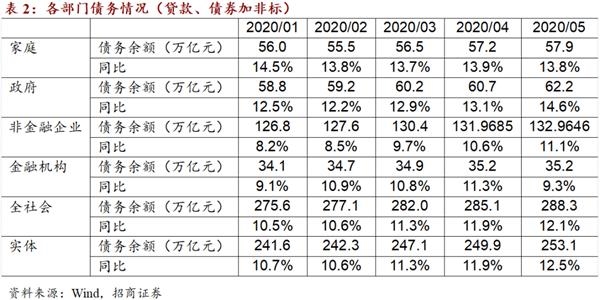 从结构上看,5月非金融企业贷款加债券余额同比增速高于前值;如果加入信托贷款、委托贷款和未贴现票据三项非标融资,亦高于前值。5月家庭部门债务余额同比增速小幅下行0.1个百分点至13.8%,中长期和短期贷款余额增速一降一升;政策层面“房住不炒”的指导目标未变,我们仍然倾向于判断,家庭部门债务余额增速未来会震荡下行,向名义GDP增速靠拢,对应房地产弱周期。政府部门债务余额同比增速5月上升1.5个百分点至14.6%,主要受地方债发行拉动。金融机构方面,目前我们能观察到的金融机构债务约为35万亿,占广义金融机构债务规模的近三成,因此其代表性较差,根据现有数据,我们倾向于判断5月广义金融机构债务余额同比增速或低于前值。