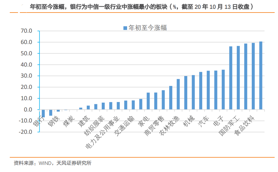 从板块涨幅来看,据天风证券统计,截止到13日收盘,年初至今银行为中信一级行业中涨幅最小的板块。