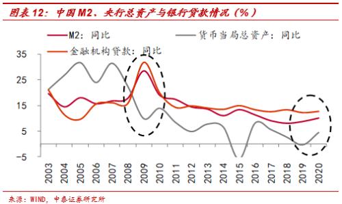 2020年我国M2较2019年增加了20万亿元,折合美元5.1万亿美元,增速升至10.1%,远高于央行总资产的增速4.5%。而货币供应量的大幅上升,主要来自于商业银行的信贷投放,2020年金融机构贷款余额增速高达12.8%,增加了19.6万亿元至172.7万亿元。2009年的特征也是如此,09年央行总资产仅增长9.9%,而同期M2和金融机构贷款余额分别增长了28.4%和31.7%。