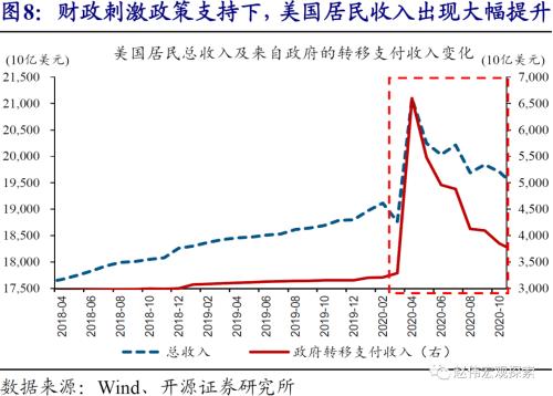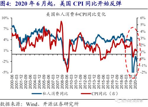 (2)美国CPI中,服务项权重高、影响大,商品项权重低、影响小。2020年6月以来,虽然与“宅经济”相关的商品消费快速修复、价格同比涨至3%以上,但由于服务消费受疫情反弹压制、修复缓慢,服务项价格同比持续负增,拖累CPI同比远低2%。